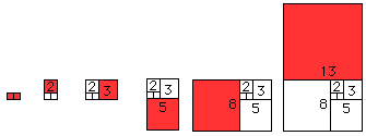 Start by drawing two, unit squares (0.5 cm is suggested) side by side. Next construct a 2-unit by 2-unit square on top of the two, unit squares. Next draw a square along the edge which borders both a unit square and the size 2 square (that is, a 3-unit square). The next square will border the 2-unit and the 3-unit squares, and each successive square will have an edge which is the sum of the two squares immediately preceding it. Continue until you have drawn a final square bordering the 13-unit and 21 unit squares.