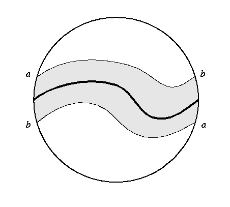 Note that a small neighborhood (grey) of this curve forms a Möbius band, so this surface is non-orientable. The rest of the surface (white) forms a topological disk (once the identification on the boundary is made), so the real projective plane is a Möbius band with a disk attached along its boundary curve. This makes the projective plane one of the fundamental surfaces, in that it is in some sense the smallest non-orientable surface.