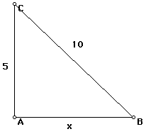 Notice in the figure above that 10 is the length of the hypotenuse, 5 is the length of one leg, and that x is the length of the other leg. We can use this and the Pythagorean Theorem to solve this problem.